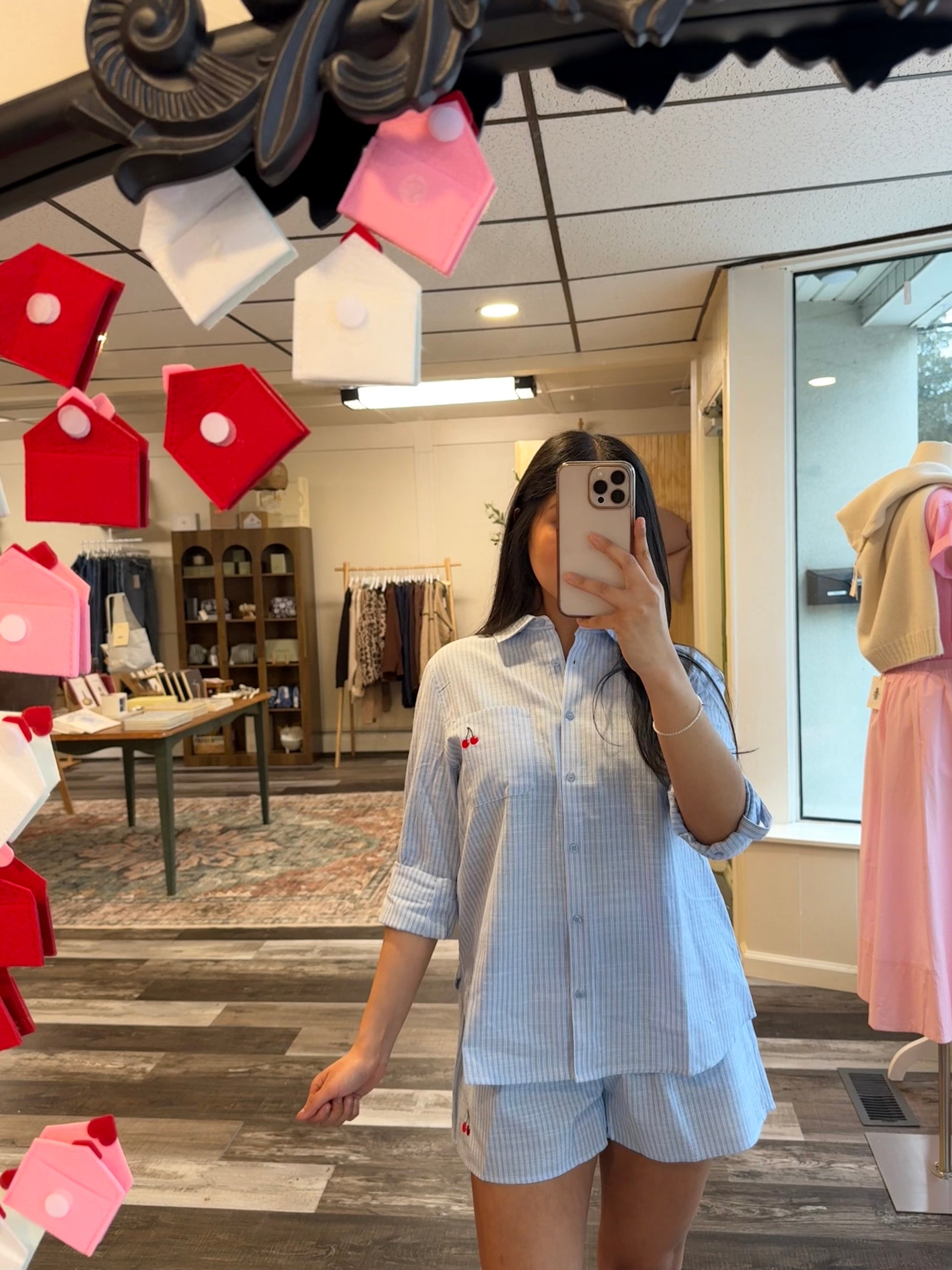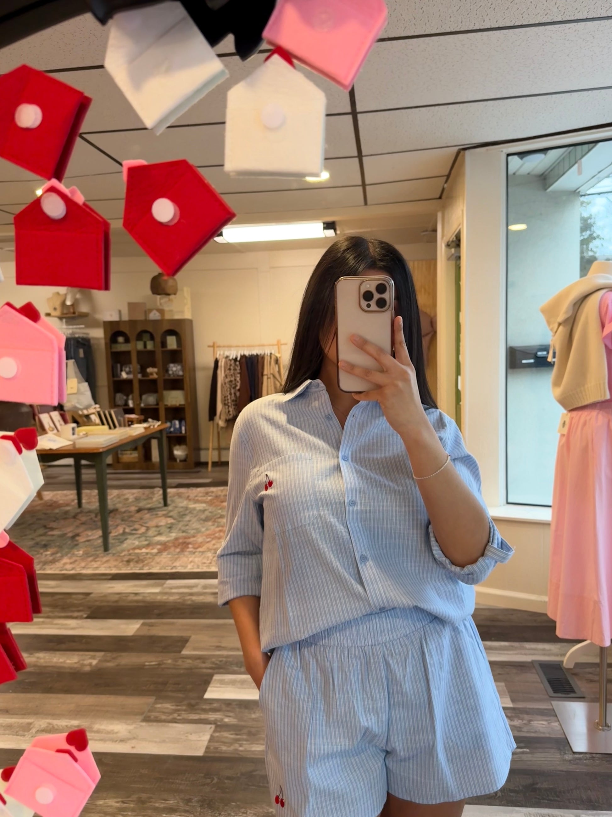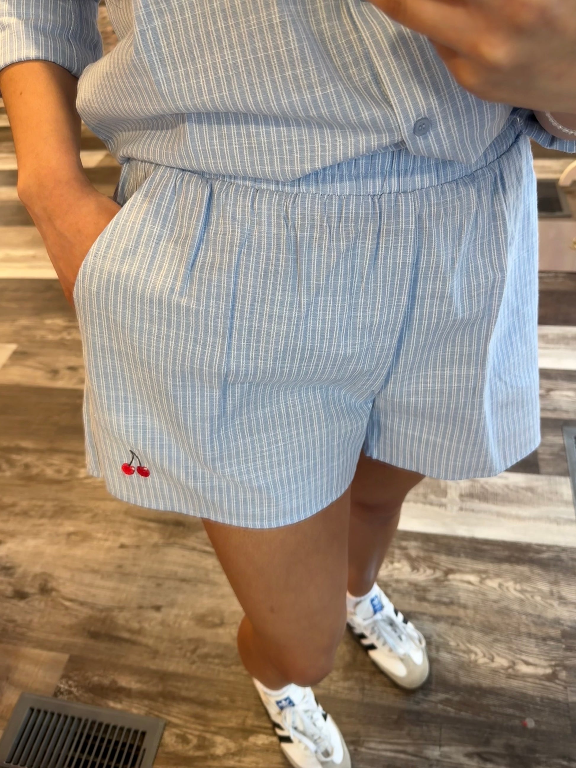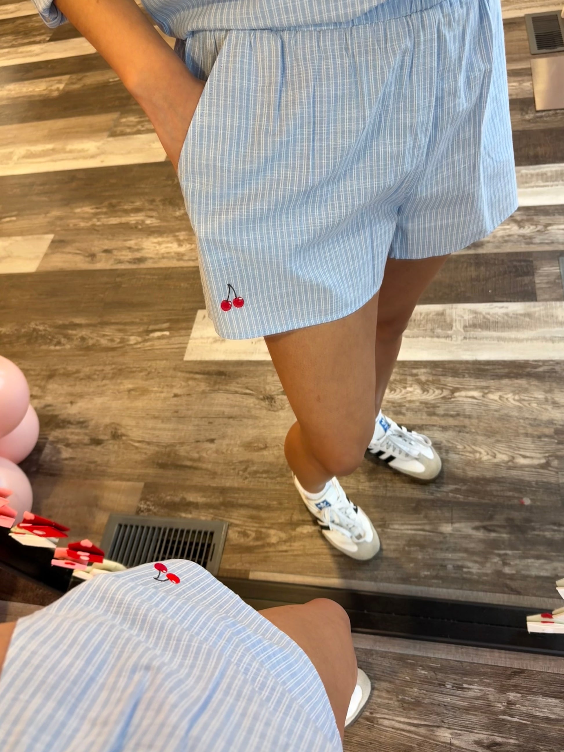 Long Sleeve button down shirt comes in blue with bottom shorts, has a stripe woven detail and embroidery details as a cherry. Set