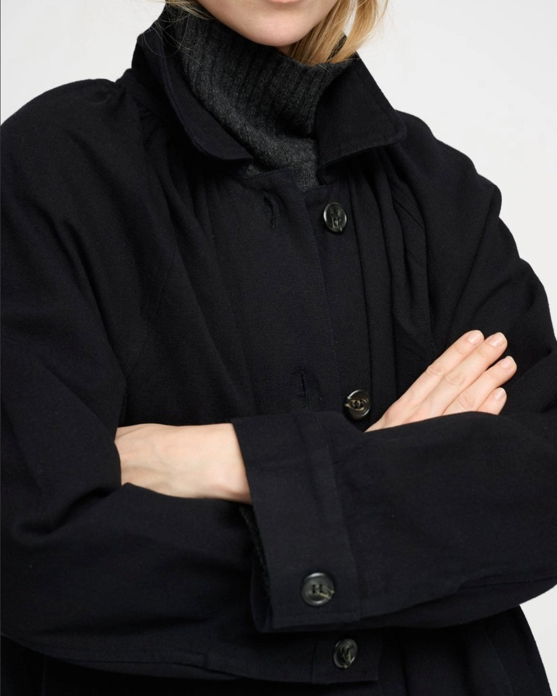 Long canvas coat in a slightly oversized design with side pockets, full button closure, and buttoned cuffs. Note the decorative pleats that give the coat a beautiful drape. The coat is made from 100% certified organic cotton. The certification ensures organic origin and that the material is processed in an environmentally and socially responsible way.