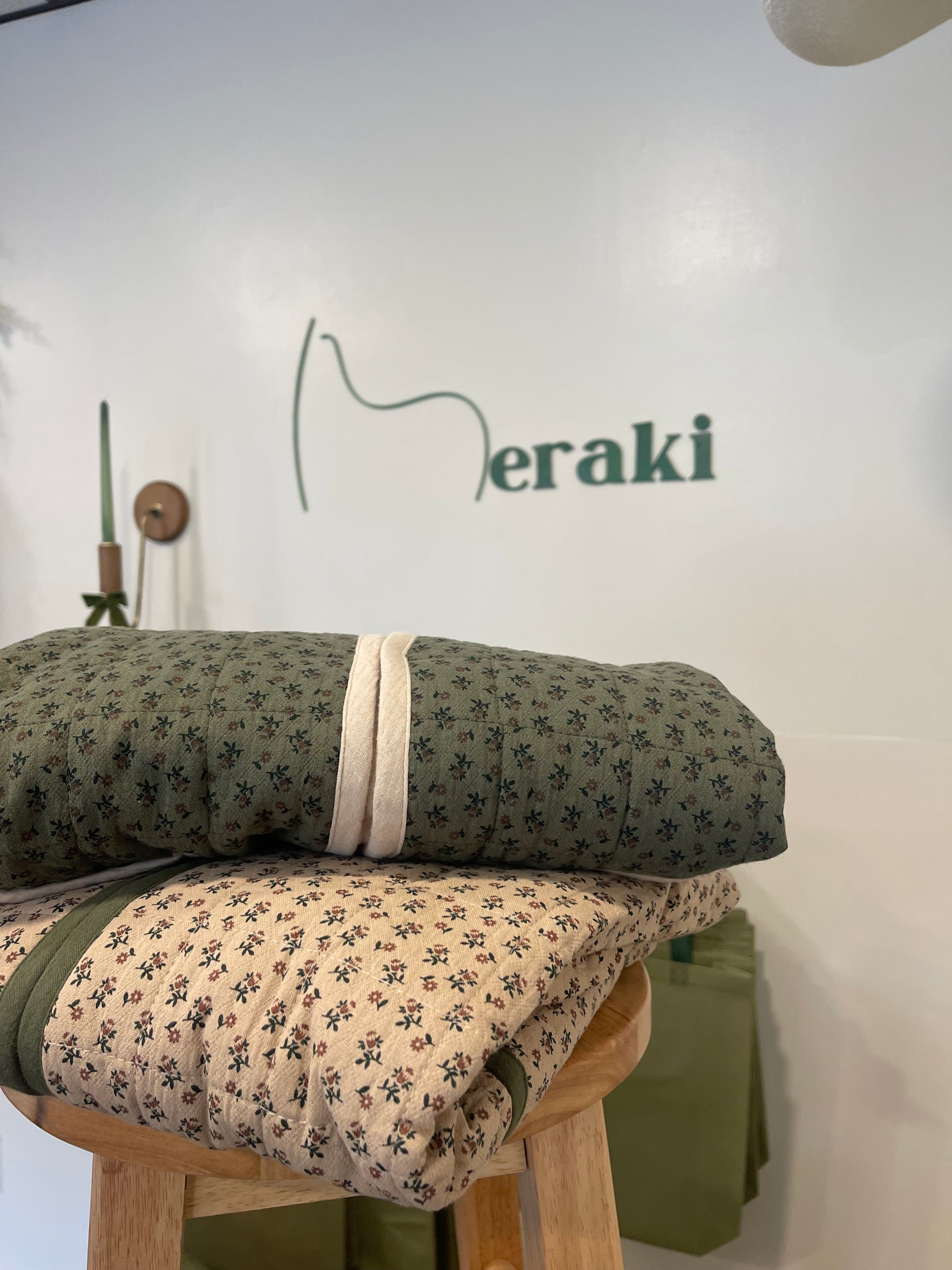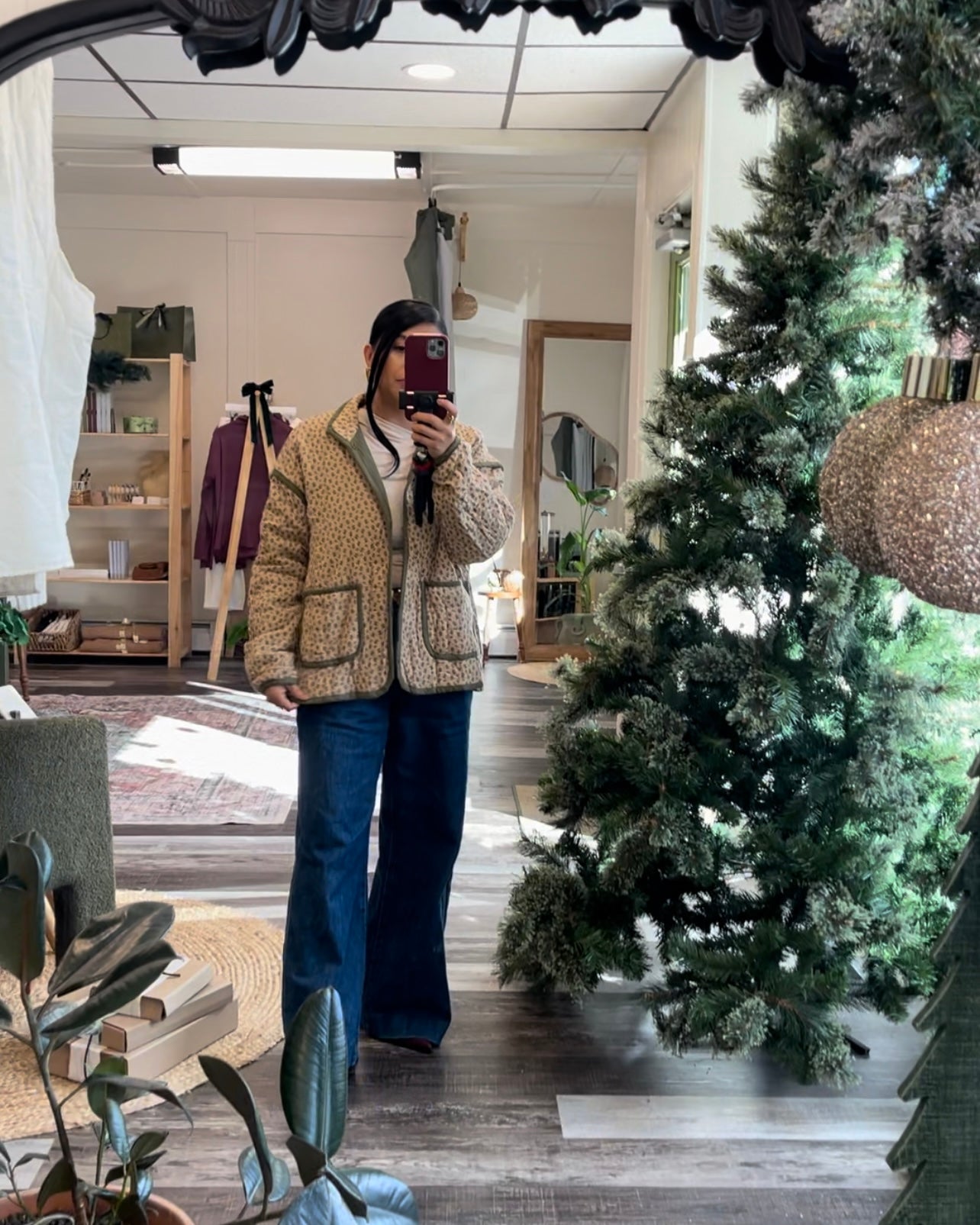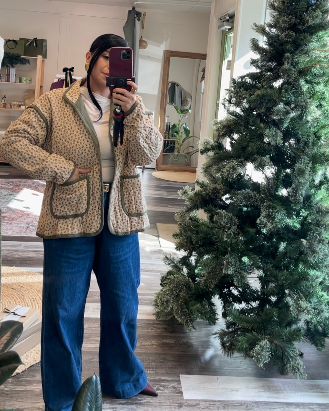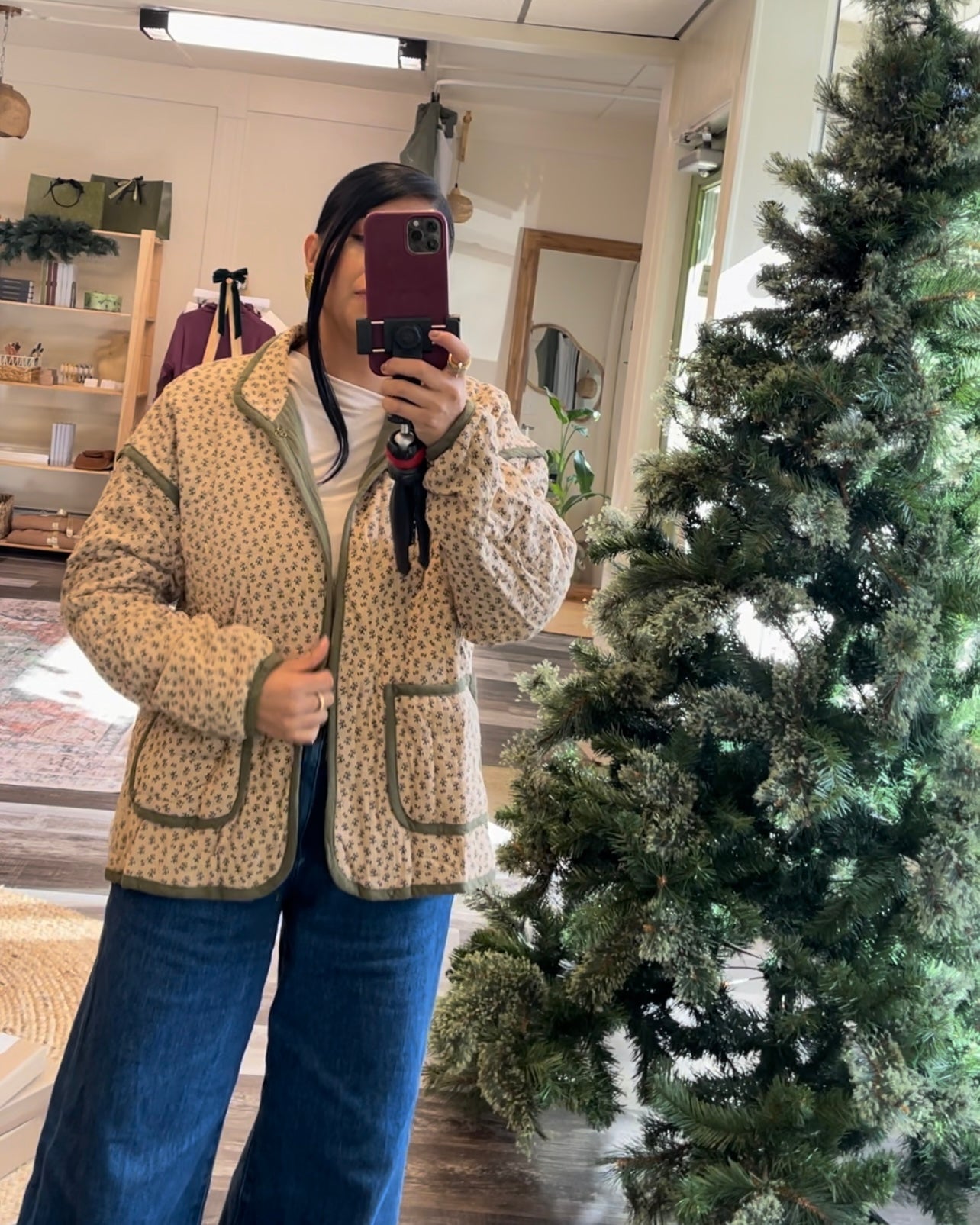 Cotton Print Stand Collar Long Sleeve Padded Coat. This collar quilted jacket features a delicate floral print pattern in two colorways. Premium cotton construction with contrast trim detailing along collar, cuffs, pockets and edges. This is a fun relaxed, boxy silhouette with comfortable long sleeve design style.